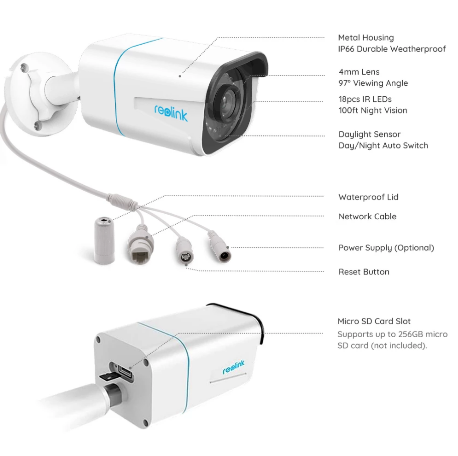 Camera de supraveghere Reolink RLC-810A este dotată cu o rezoluție de 4k Ultra HD day&night și cu functia PoE, putind fi conectată printr-un singur cablu (cu condiția să fie utilizat un DVR/NVR, un router sau un comutator PoE).
